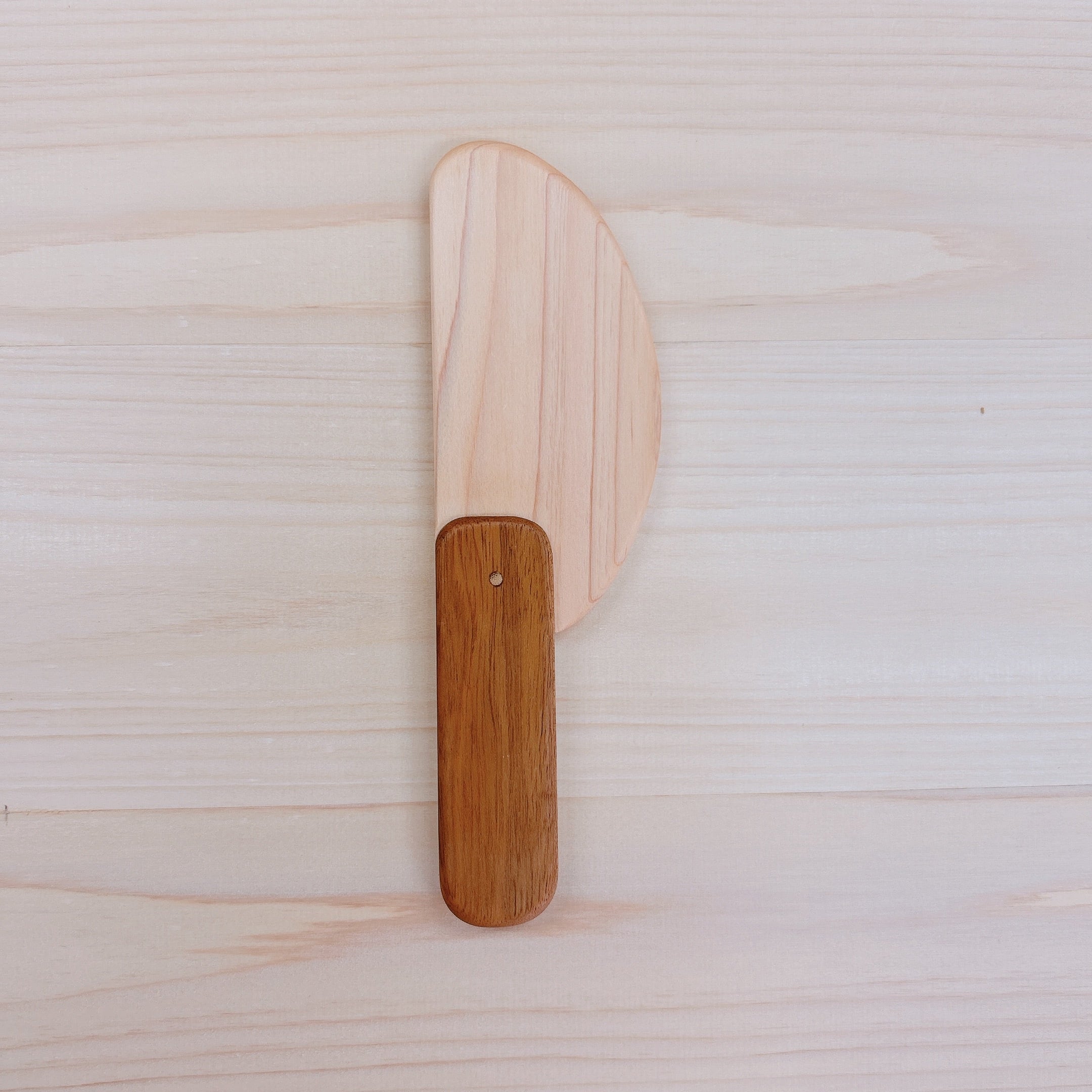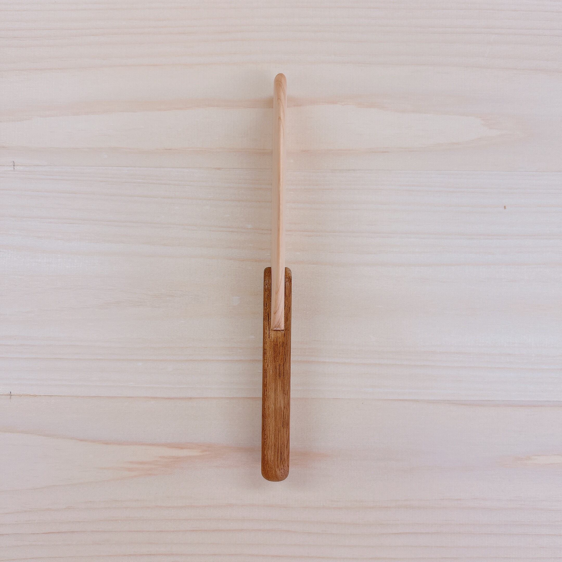 刃の部分はヒノキ、持ち手部分はムクの木で色のアクセントをつけています。